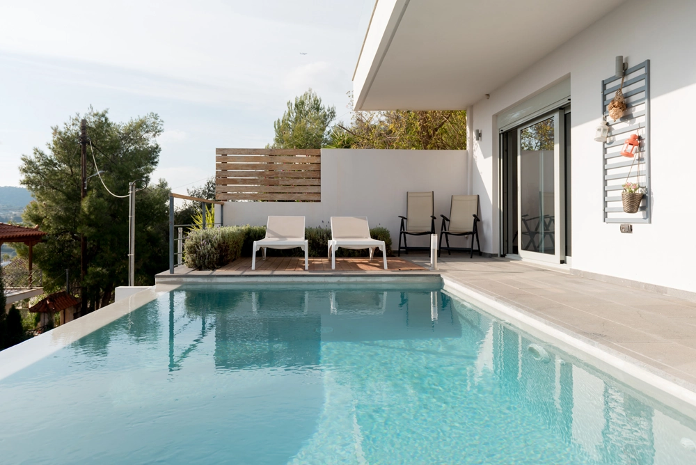Book your next dream vacation staying at the Alegria luxury villa Athens Greece. Alegria is a four bedroom luxury stylish property with a private pool situated at Lagonisi area in the neighborhood of Agios Dimitrios; a quiet spot with amazing sea views, serenity and privacy.