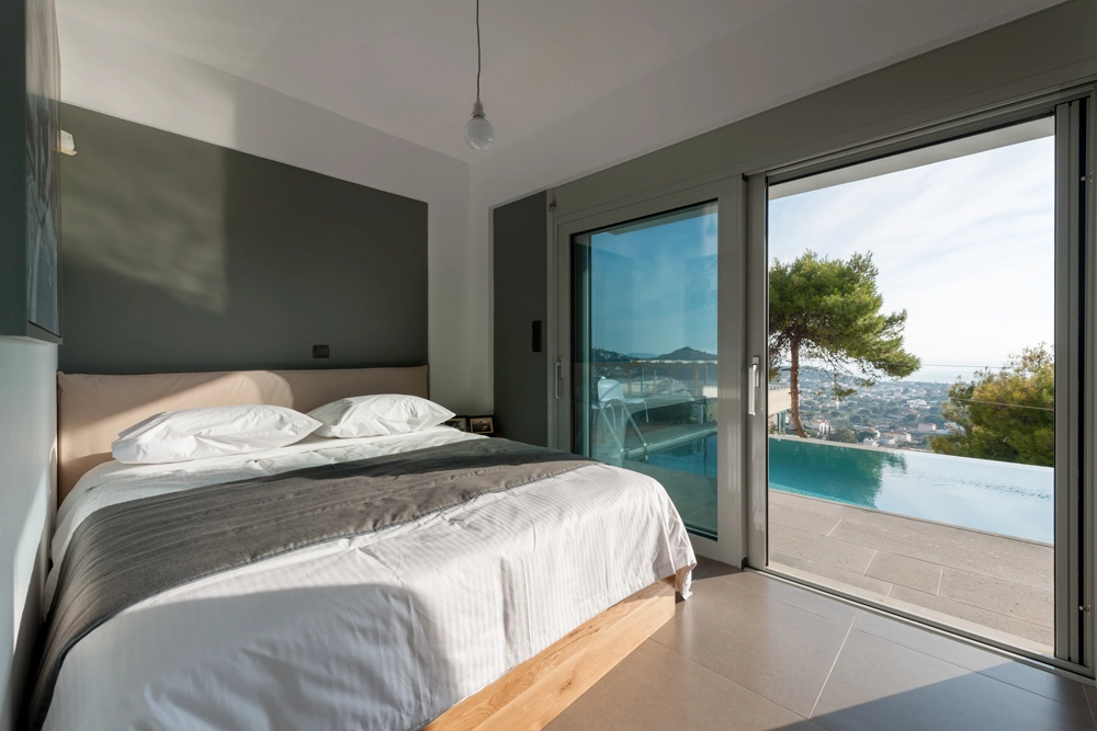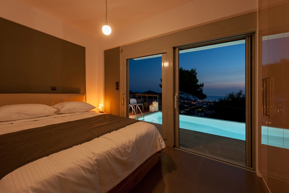 Bedroom 1: King size bed, direct exit to the pool, offers pool views and sea views