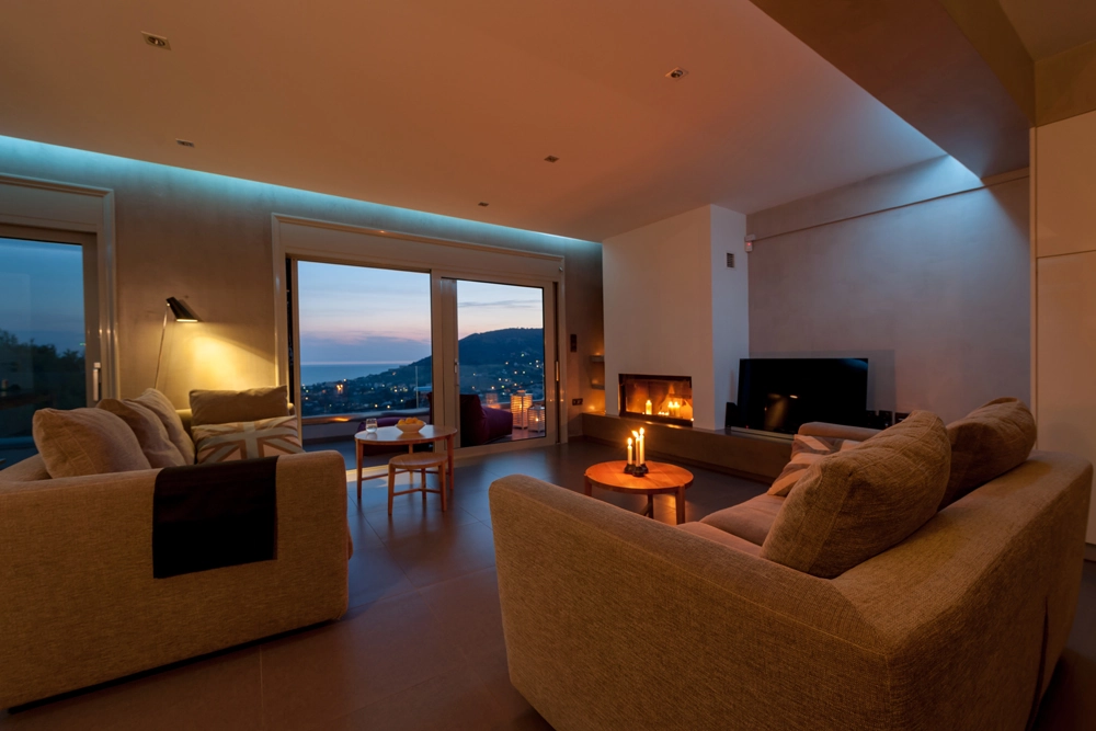On the third floor you can find a stylish open plan floor with comfortable living area with fireplace, dining area and fully equipped kitchen. The whole floor has amazing sea views and has exit to balconies with views. This floor has amazing secret lighting that creates you a special atmosphere. A guest WC serves this floor. There is also an exit to the