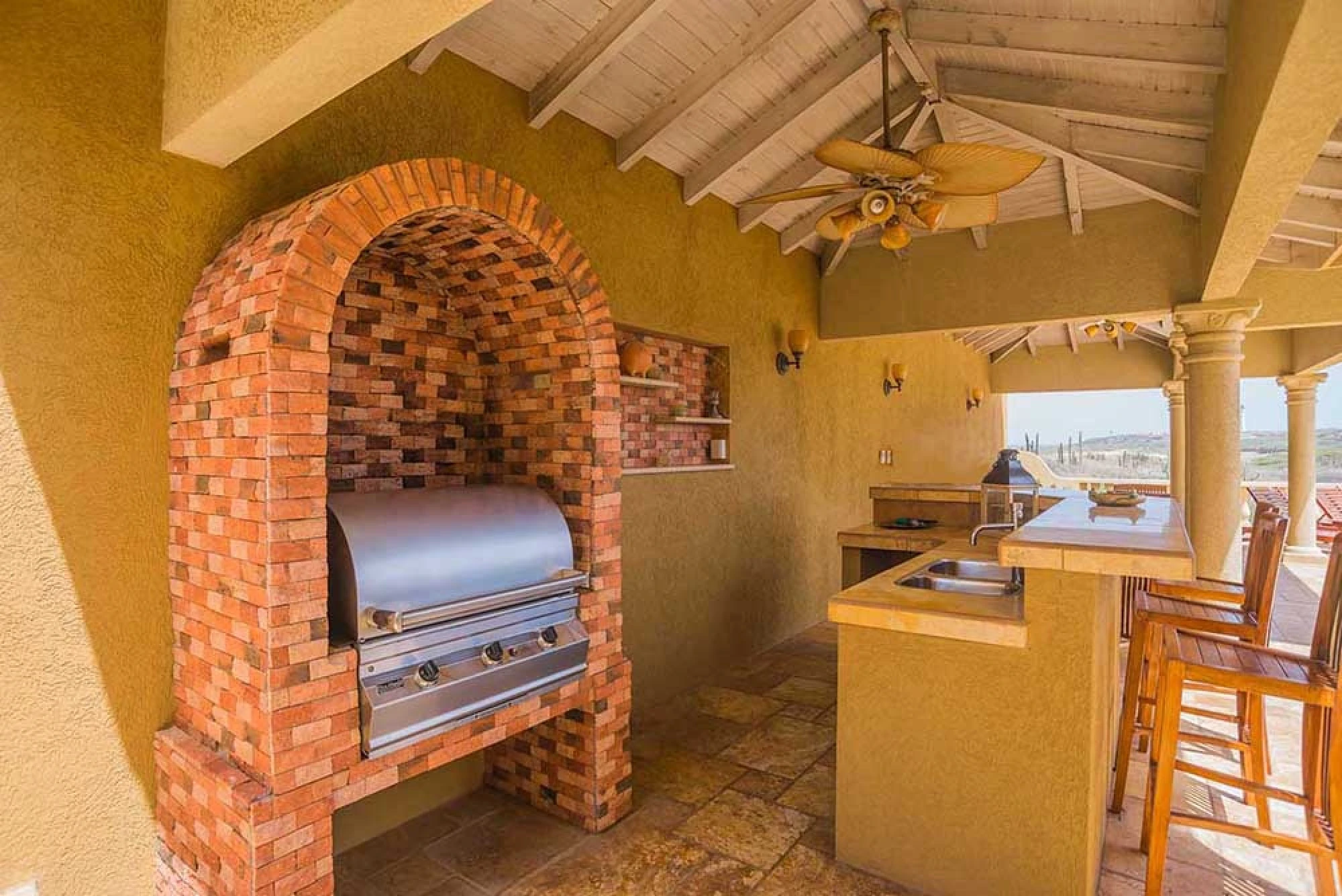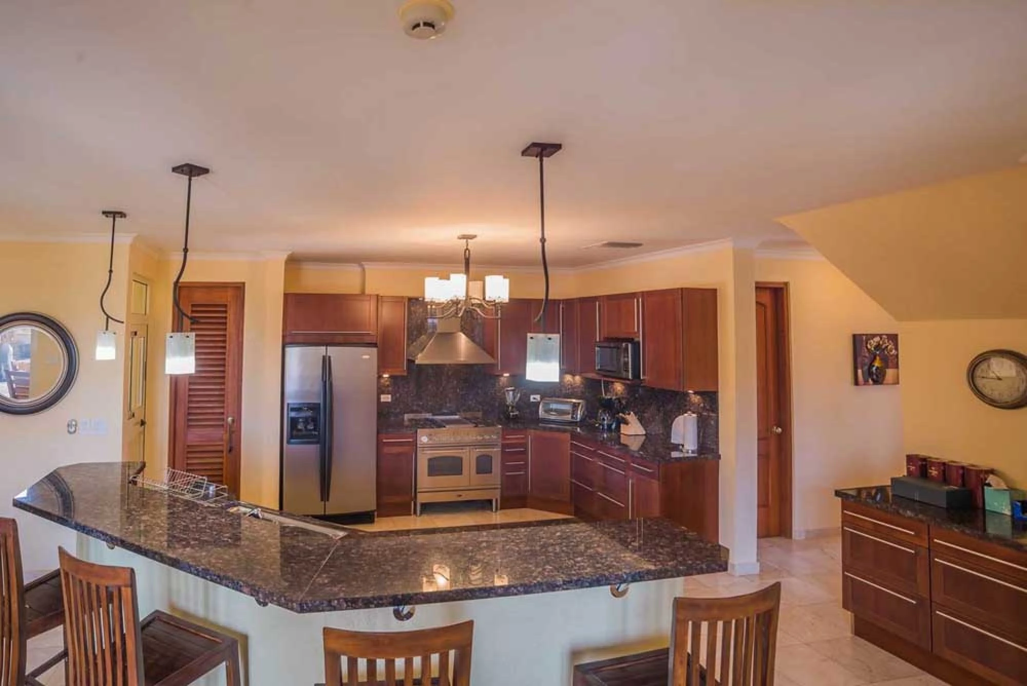 On the first floor this estate home offers a guest bedroom with king size bed and en-suite full bathroom and a master suite with a king size bed, his & hers walk-in closet and large master bath with soaking tub and separate shower. This master suite has also a furnished private patio with ocean view adjacent to the pool area. This open plan house features a large very well equipped kitchen with breakfast bar with chairs, separate dining table in the living room with 10 chairs.