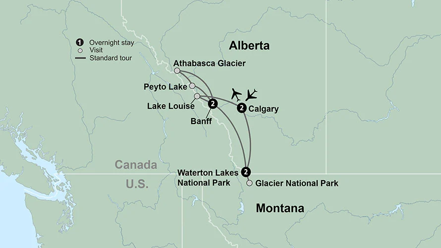 Day 1: Calgary, Alberta, Canada Tour Begins Get ready for an adventure that brings together the beautiful expanse of the prairies, the soaring majesty of the Canadian Rockies and the brilliance of Montana’s Glacier National Park. Your tour opens in the province of Alberta. Mingle with your fellow travelers during a cocktail reception this evening.