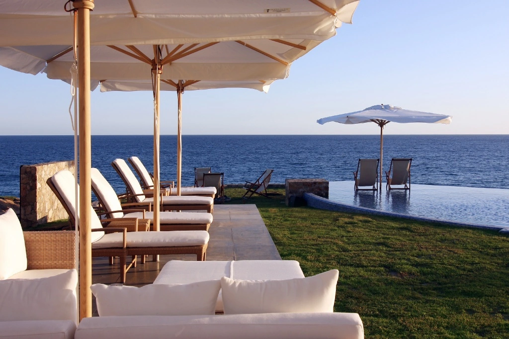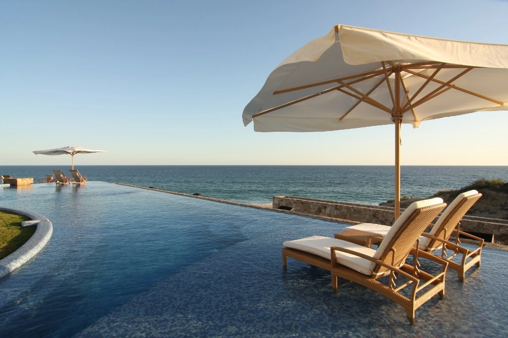 On the pool terrace above, the 100ft infinity pool seems to flow into the waters of the Cortez, creating a relaxing space to soak up the panoramic vistas of sea and sky.