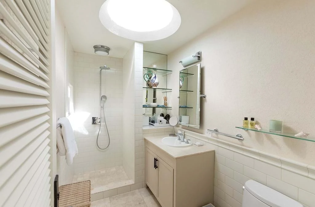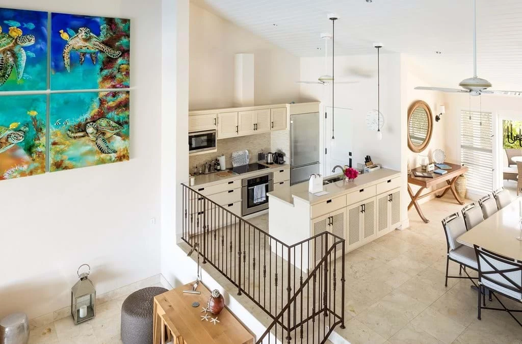 The comfortably casual environment is suffused with a soft color palette of neutrals, celadons and ocean blue. Stone flooring and white woodwork throughout create an inviting, crisp tone. Tongue-and-groove wood ceilings are painted white and feature state-of-the-art recessed lighting. As a result of the open floor plan, the view on arrival into the villa is filled with the turquoise sea beyond. Spaces flow effortlessly from one to the next, from the dining area to living room to the outdoors.
