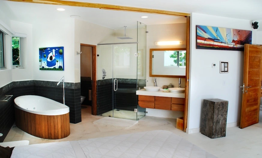 Kite House offers 4 very unique bedrooms with en-suite bathrooms that can accommodate up to 8 adults, plus 2 teens. The villa offers truly unique views from the bedrooms. The master suite opens up onto the pool deck where you can get a glimpse of the Caribbean Sea, the second bedroom boasts unique views of the ancient Mayan Ruins, the third bedroom has a terrace that opens up to lush tropical gardens and jungle, and the fourth bedroom is considered to be a loft with it's pull out king bed, and upper mezzanine that also has room to host another 2 guests with the second king size bed.