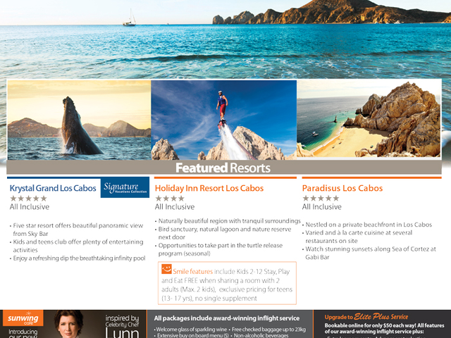 | Los Cabos Vacations with Air from $435 In Los Cabos, where the Sea of Cortés meets the Pacific, there is a tailor-made experience for those looking for a truly luxurious holiday. The welcoming atmosphere invites travelers to go sport fishing, golfing on signature courses, scuba diving, snorkeling and kayaking in quiet coves and inlets for the most passionate marine life explorers, taking to the outback on ATVs, bikes and horseback, relaxing and rejuvenating in high-end spas and luxury resorts, or dancing till dawn. In Los Cabos, you will find the laid-back and sophisticated experience that you need to leave the cares of everyday life behind. Vacations include: round-trip flights, hotel accommodations, taxes and more |
