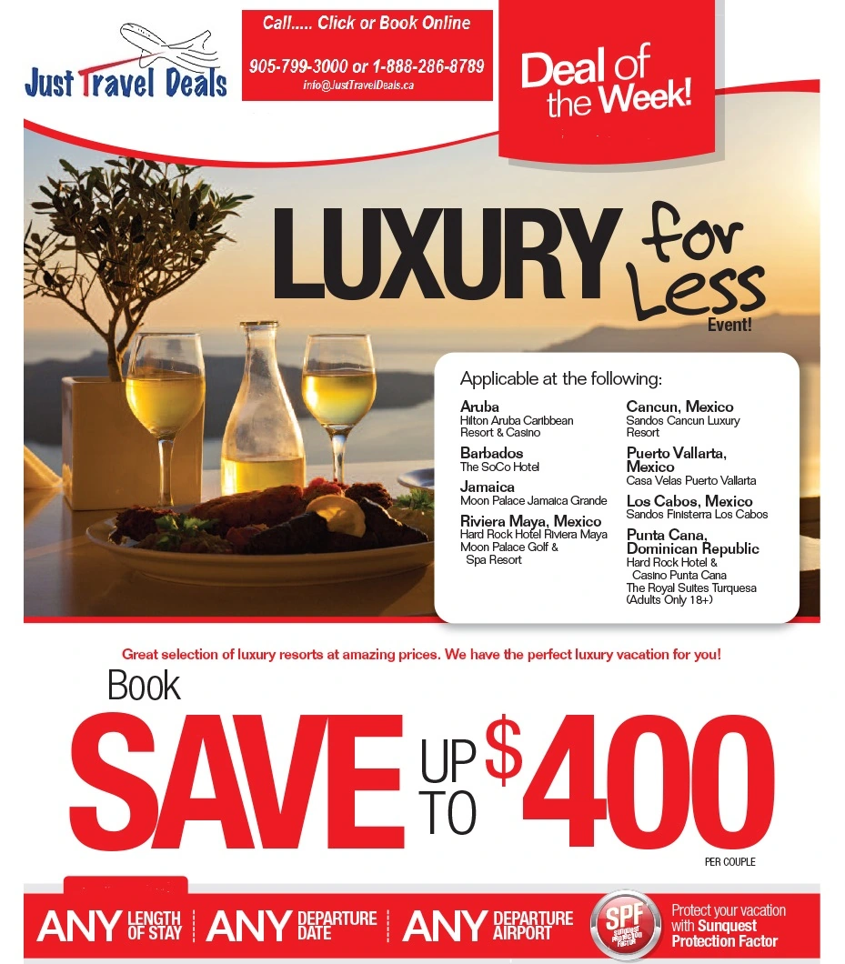 Book and SAVE up to $400* per couple! Applicable at the following: Aruba - Hilton Aruba Caribbean Resort & Casino Barbados - The SoCo Hotel Jamaica - Moon Palace Jamaica Grande Riviera Maya, Mexico - Hard Rock Hotel Riviera Maya, Moon Palace Golf & Spa Resort Cancun, Mexico - Sandos Cancun Luxury Resort Puerto Vallarta, Mexico - Casa Velas Puerto Vallarta Los Cabos, Mexico - Sandos Finisterra Los Cabos Punta Cana, Dominican Republic - Hard Rock Hotel & Casino Punta Cana, The Royal Suites Turquesa (Adults Only 18+) Save up to $400 is per couple and is applicable to adults only.