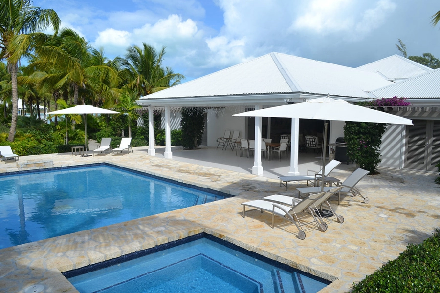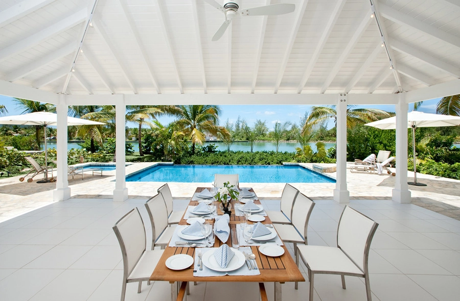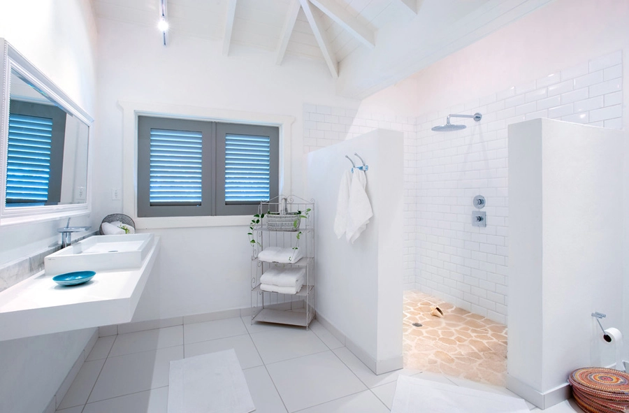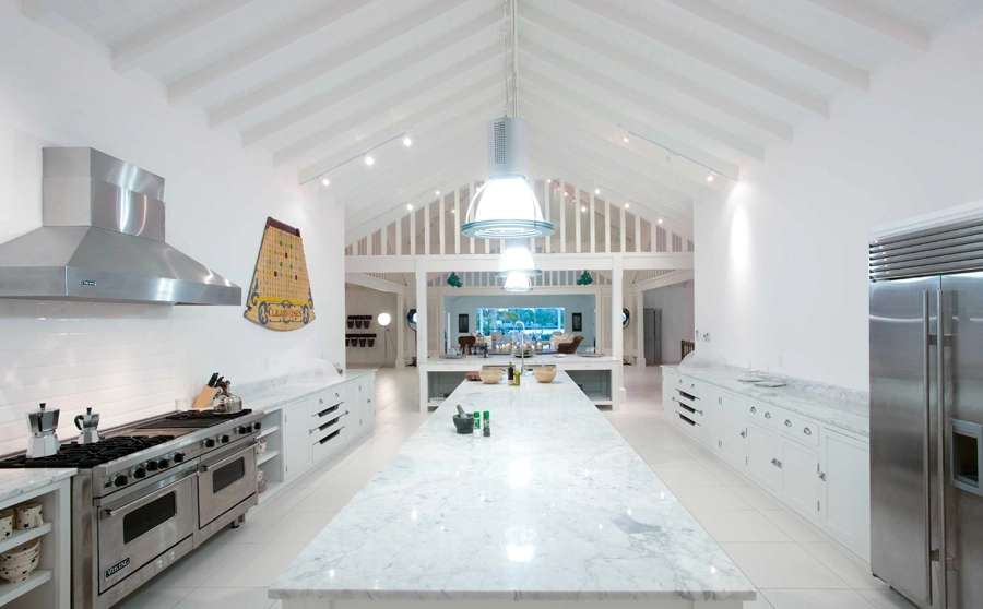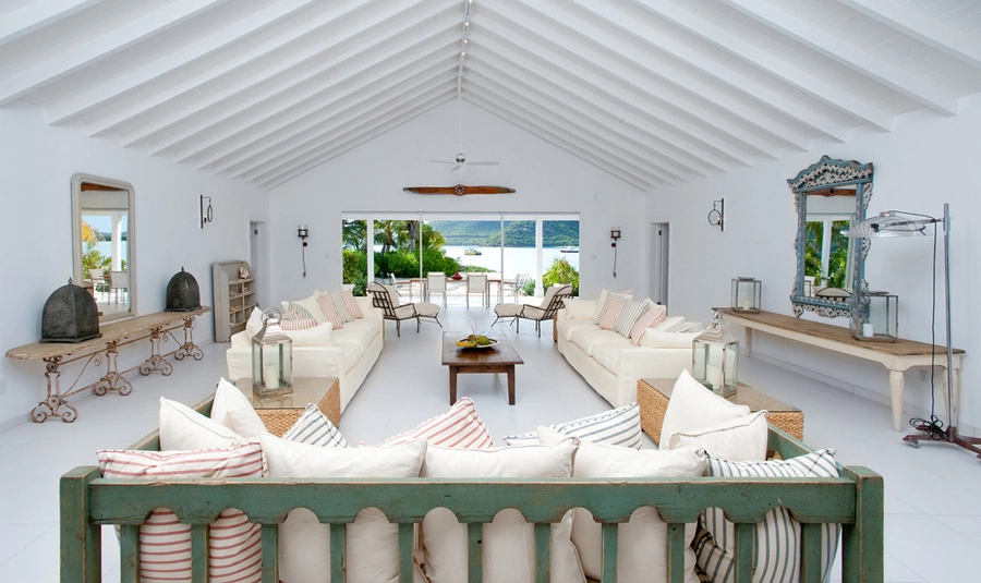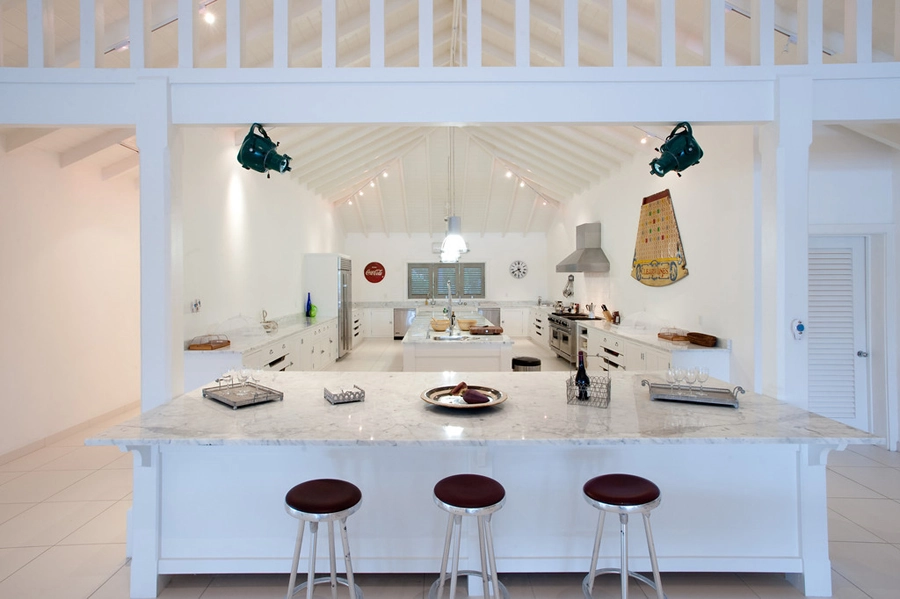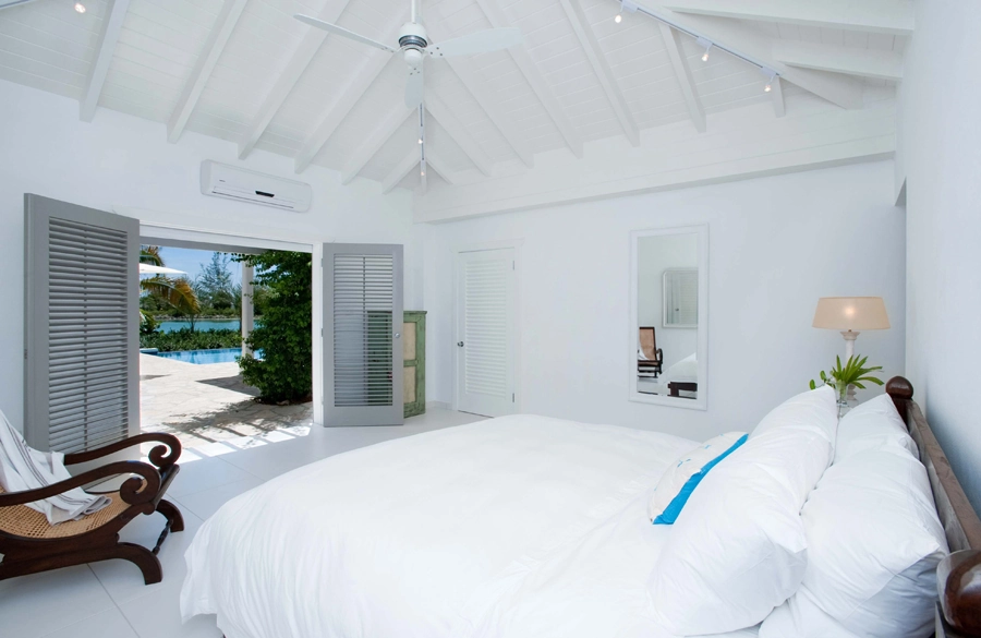 Fresh, modern and elegant with splashes of British personality, each of the seven bedrooms at Palm Point feature vaulted ceilings, all-white interiors and French doors with views of the brilliant blue Caribbean Sea and exotic gardens.