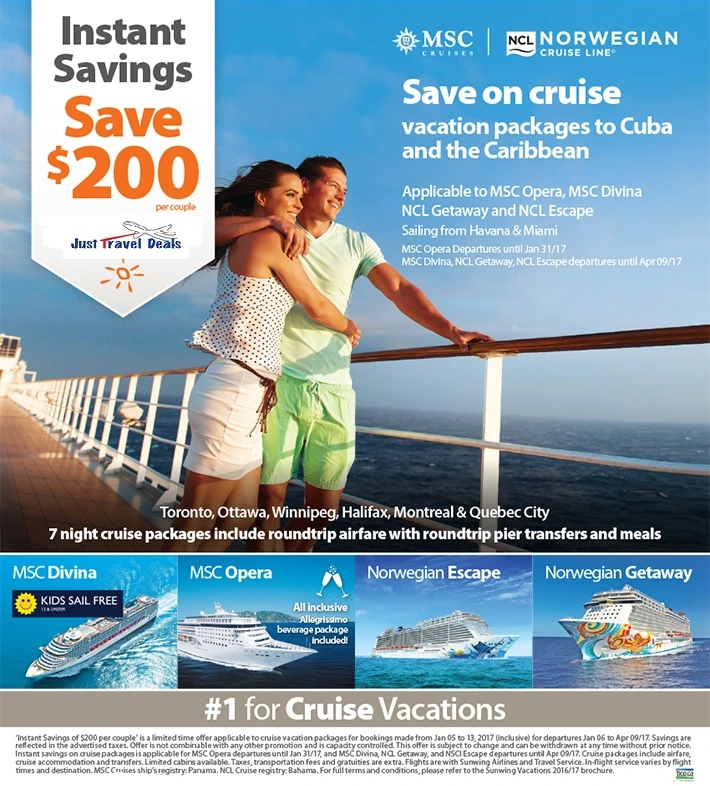 Save $200 per couple with MSC and NCL Cuba & Caribbean cruises. MSC Divina, MSC Opera, Norwegian Escape & Norwegian Getaway from Toronto, Ottawa, Winnipeg, Halifax, Montreal & Quebec City