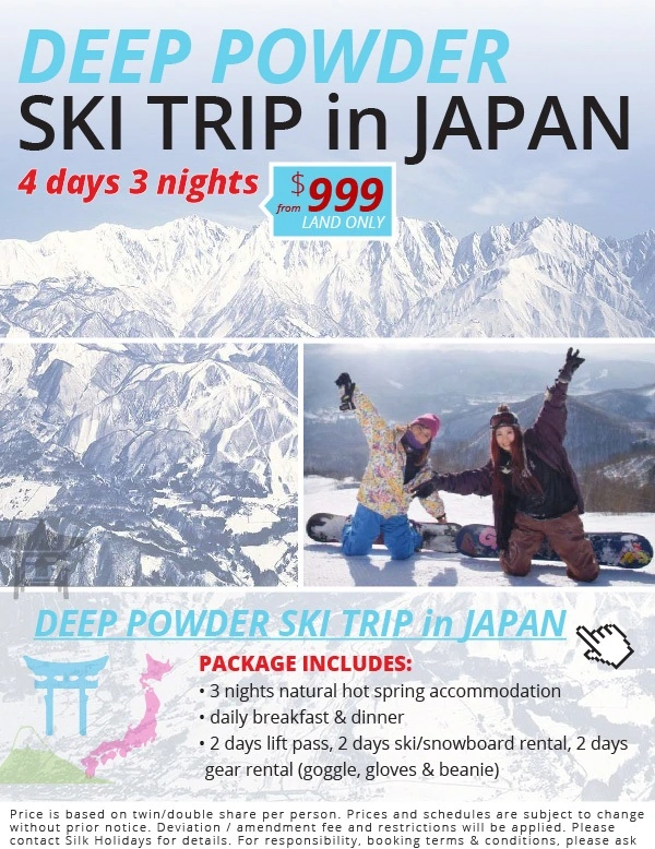 Deep Powder Ski Trip in Japan Package Includes 3 Nights natural hot spring accommodations daily breakfast and dinner 2 days lift pass, 2 days ski/snowboard rental, 2 days gear rental