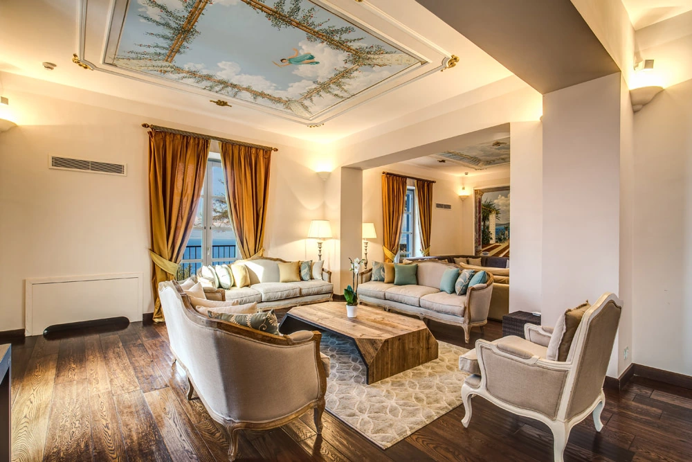 The bright interiors are comfortable and welcoming. High-end details such wood floors, vaulted fresco ceilings, hand-painted ceramic tiles make villa Stradivari a great accommodation for those looking for understated luxury. Large areas, generous French doors opening up to majestic sea-views, sitting rooms with plush sofas, timeless and refined dining room with ample seating for large groups, these are the social spaces available at the villa. A small and convenient kitchen to serve light meals, besides the commercial grade one on the ground floor, and a panoramic covered terrace are also on this level.