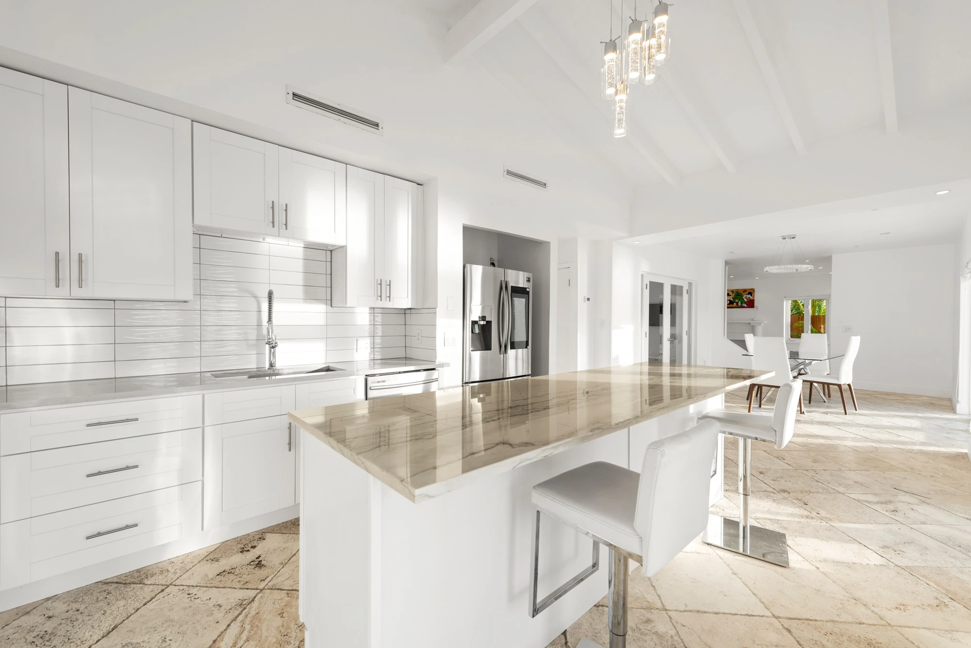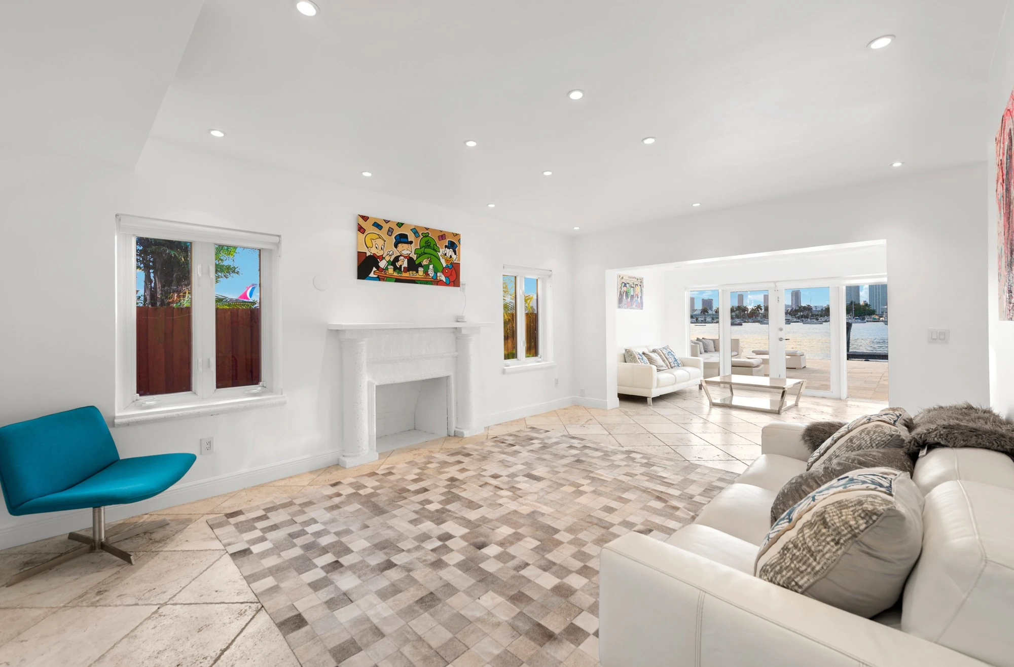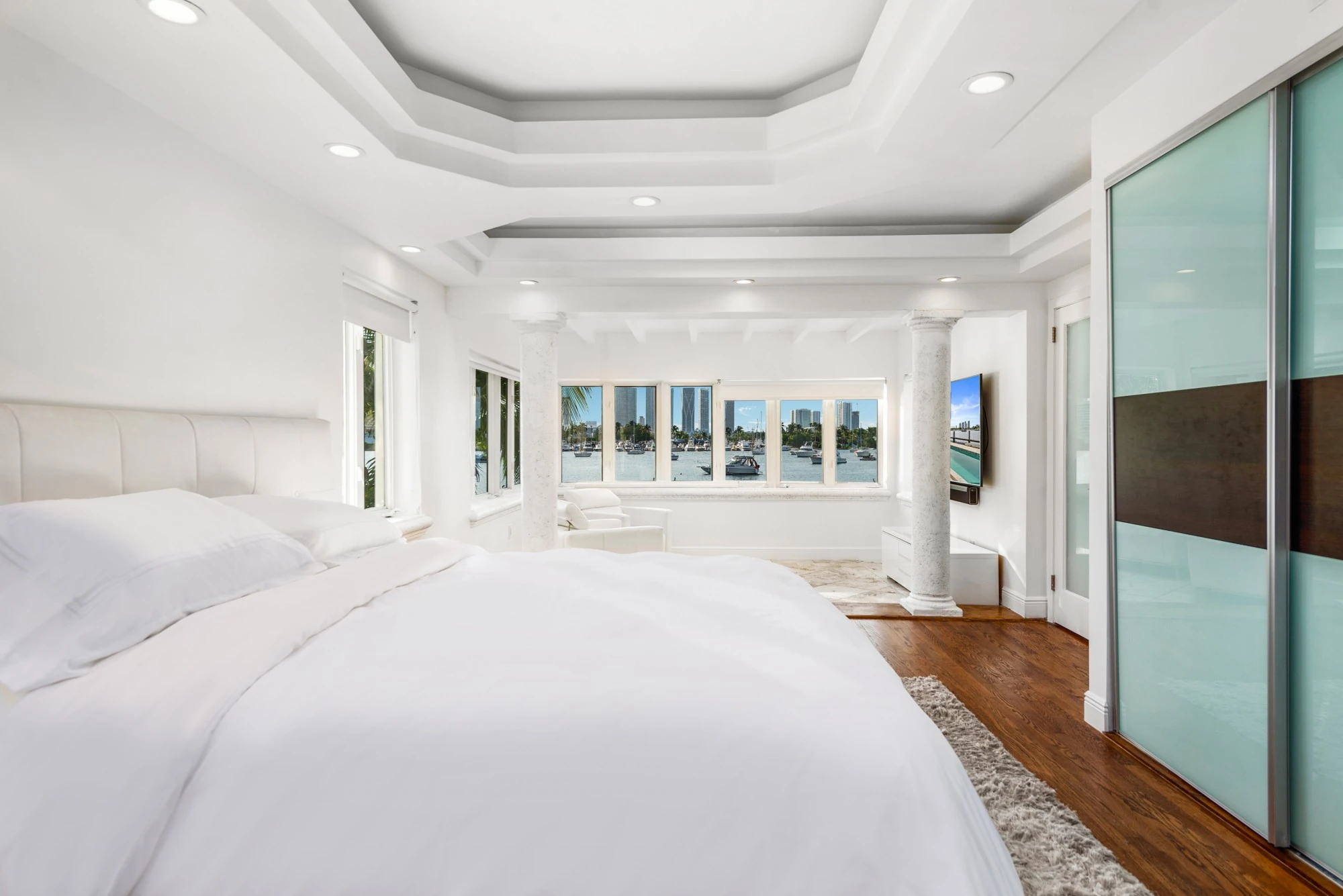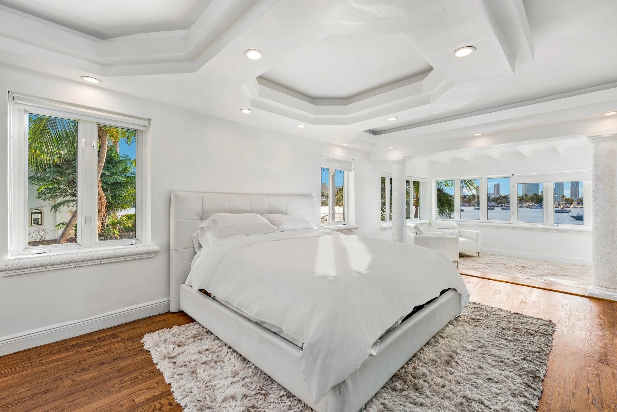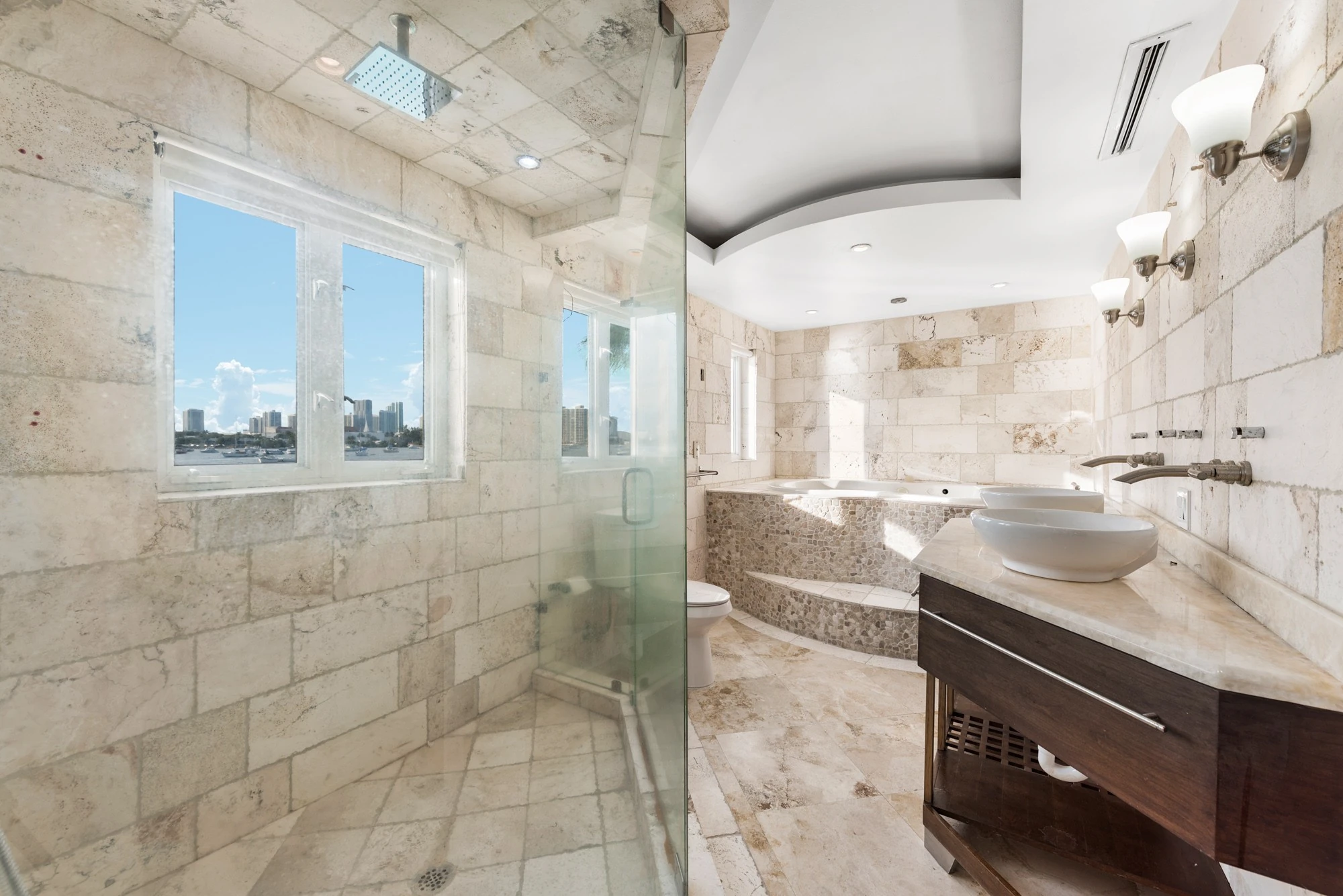 Combined with classic elements and contemporary styling, the villa features sensational water and downtown skyline views. The spacious 2-story villa includes floor-to- ceiling windows and a formal dining area with wrap-around views of the gardens and pool.